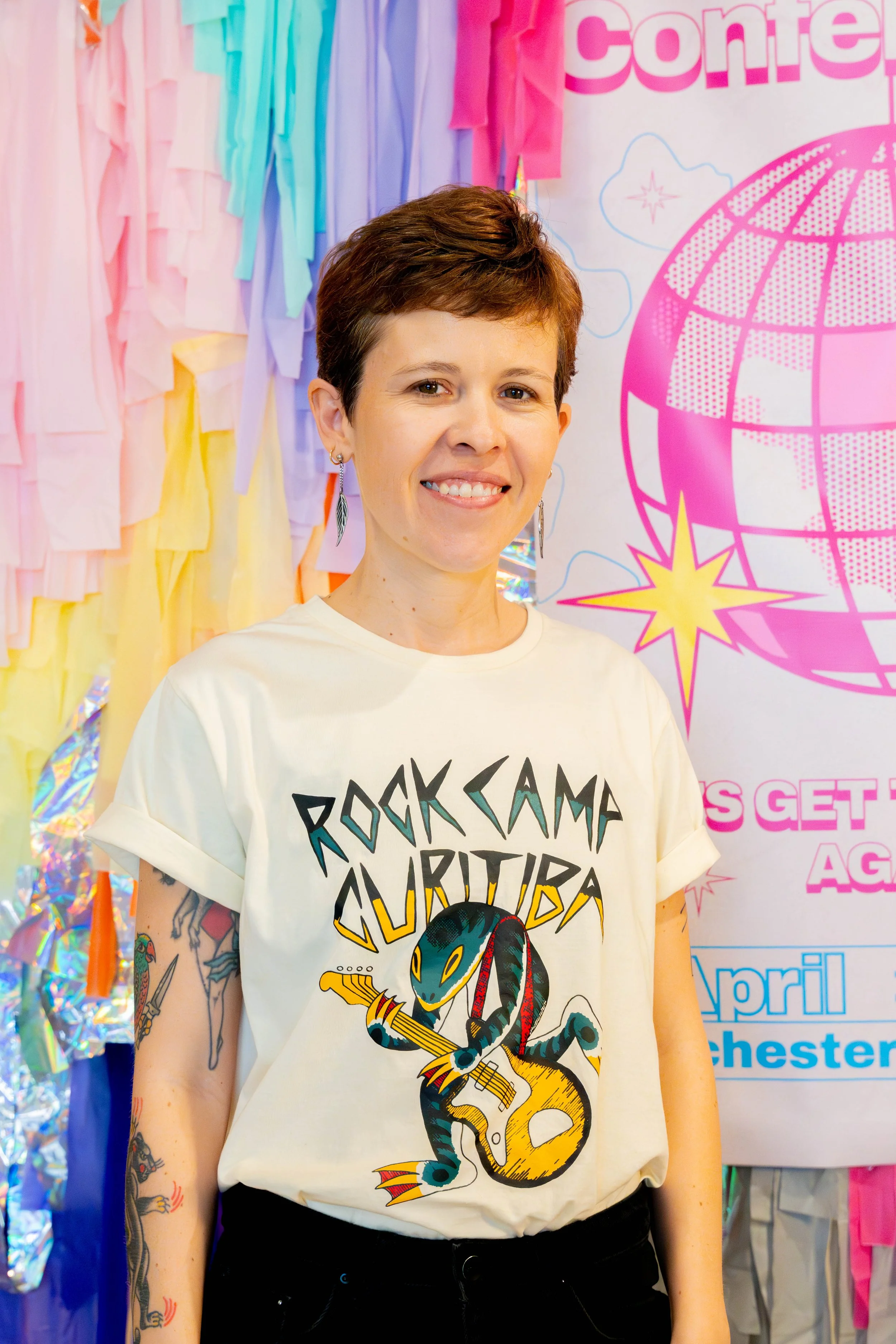 Bio: Gabriela Pinheiro has been the coordinator of Rock Camp Curitiba (Brazil) since its founding in 2017. She works as a UX Designer and plays drums in Patada, a punk band formed by women and non-binary members. Photo by @gloria.c.zavaleta